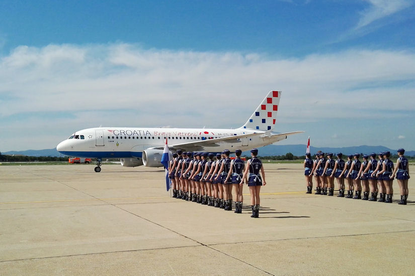 Zagreb, 16.7.2018.- Zrakoplov Croatia Airlinesa sa svjetskim nogometnim doprvacima sletio je u ponedjeljak u 14.50 u zagrebaèku Zraènu luku Franjo Tuðman. Zrakoplov hrvatskog nacionalnog avioprijevoznika - Airbusa 319, na kojem je s obje strane trupa pisalo "Bravo vatreni", do mjesta zaustavljanja proao je ispod luka kojeg su napravili vodeni topovi iz vatrogasnih vozila, a reprezentativce je doèekao crveni tepih i zagrebaèke maoretkinje. foto HINA/ Dario GRZELJ/ ua