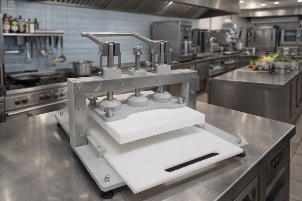 Presso omogućuje bržu, tišu i uredniju pripremu mesa, bez špricanja i bez zamaranja ruku. Umjesto klasičnog lupanja, meso se obrađuje kontroliranim pritiskom, što rezultira ujednačenijom kvalitetom i boljim izgledom gotovog proizvoda.